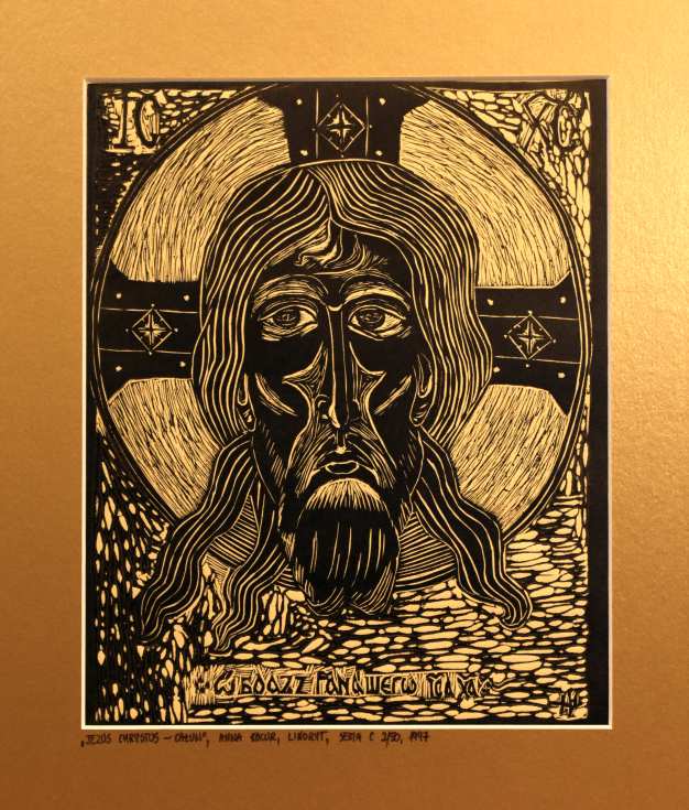 Przedmiotem sprzedaży jest obraz na ścianę - grafika, ręcznie wykonywana (ang. hand made) w technice linorytu na papierze metalicznym w kolorze jasnego lub ciemnego złota i ręcznie odbijana na prasie drukarskiej, oprawiona w passe-partout o kolorze złotym metalicznym. Prezentowany kolor passe-partout może nieznacznie odbiegać od koloru gotowego produktu. Grafika może stanowić oryginalny prezent dla kolekcjonerów ikon lub dekorację stylowego wnętrza.